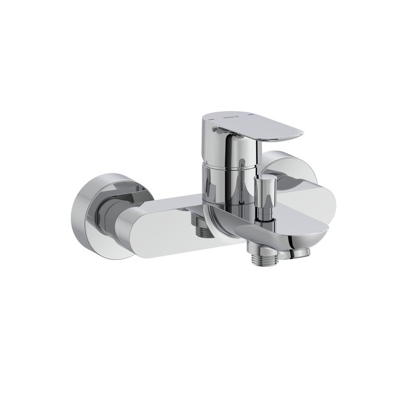 Misturadora monocomando exterior para banho-duche Roca Cala A5A026EC00 concebida para instalação mural em banheira com acabamento cromado de alta resistência, equipada com inversor automático que facilita a transição entre banheira e duche e cartucho cerâmico para controlo preciso de caudal e temperatura, apresenta design elegante com corpo cilíndrico estilizado e manípulo plano retangular que combina estética moderna com funcionalidade técnica, incorpora as tecnologias Evershine® para brilho duradouro e facilidade de manutenção e SoftTurn® para operação suave e confortável, garantindo desempenho fiável e integração harmoniosa em espaços de banho contemporâneos com ligação de água padrão 1/2” e esgoto não incluído.