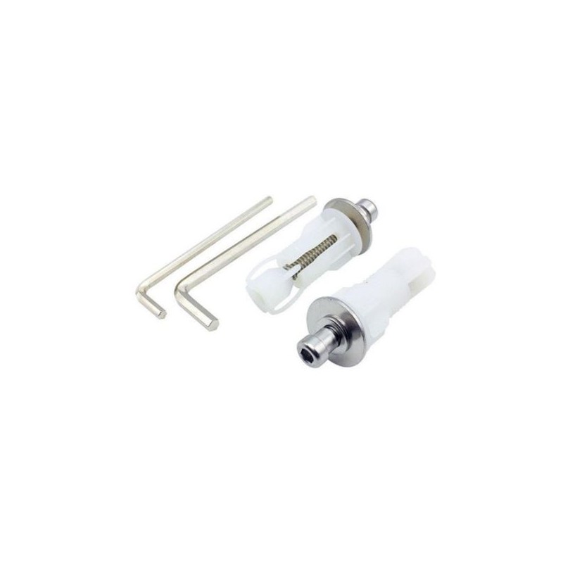 Kit de fixação para assentos de sanita com queda amortecida. Inclui 2 parafusos de fixação, dois tacos de expansão para porcelana e duas chaves allen de aperto.