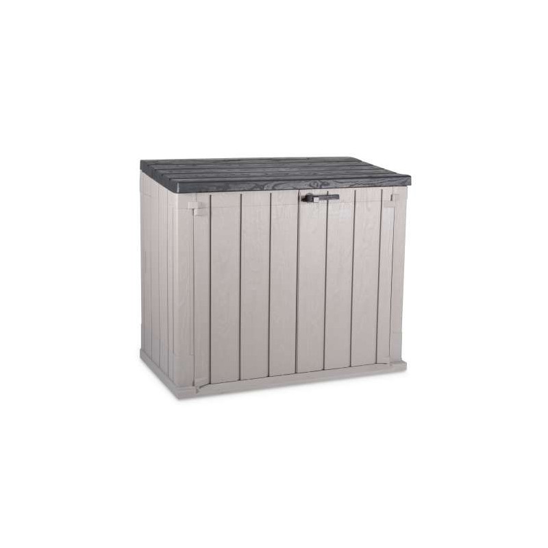 Baú ao ar livre com 2 portas da frente. Abertura vertical da tampa com pistões. Fundo anti-estagnação com brecha. Piso com rampa de fácil acesso. Pode ser ancorado no solo. Fecho com alça e barra de reforço de metal. Resistente a UV.