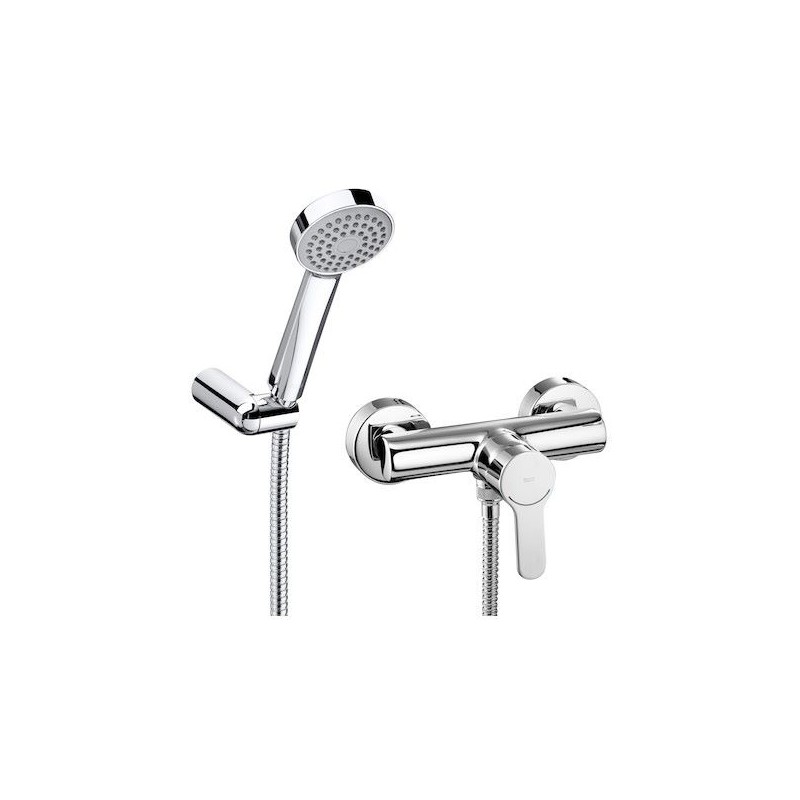 Misturadora monocomando exterior para duche Roca L20 A5A2009C02 em acabamento cromado concebida para instalação mural com chuveiro de mão Stella incluído, flexível metálico de 1,50 m e suporte articulado, equipada com cartucho cerâmico para controlo preciso de caudal e temperatura e caudal de cerca de 8 l/min a 3 bar que promove poupança de água, apresenta operação suave e duradoura com as tecnologias Evershine® e SoftTurn®, oferecendo desempenho fiável e conforto no uso diário com design simples e funcional adaptado a espaços de duche exteriores ou interiores contemporâneos.