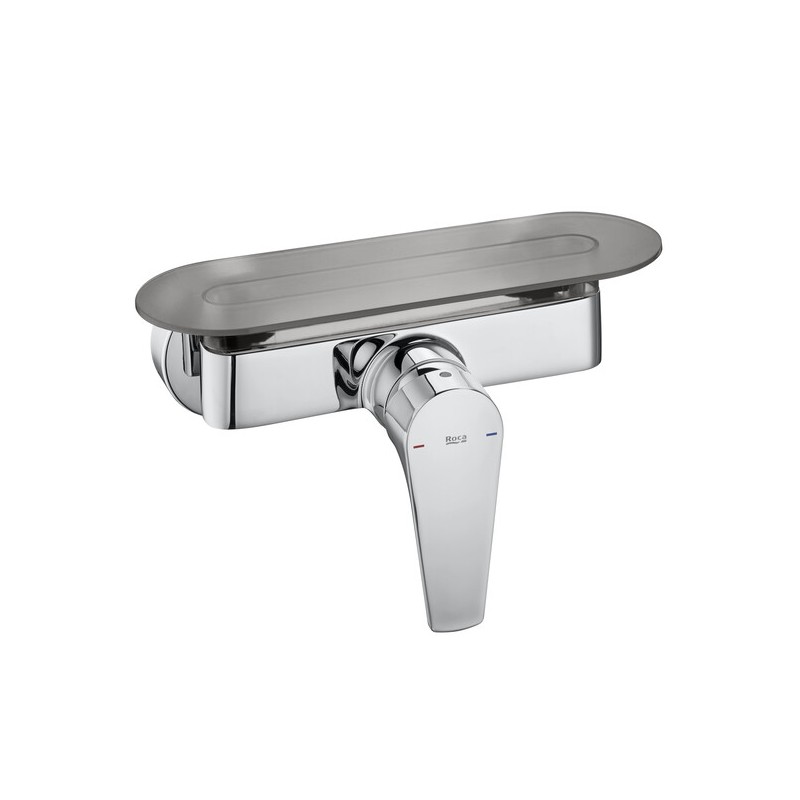 Misturadora monocomando exterior para duche Roca Atlas A5A2190C00 concebida para instalação mural com acabamento cromado de alta resistência, equipada com cartucho cerâmico para controlo preciso de caudal e temperatura, apresenta acionamento por manípulo lateral que garante operação confortável e eficiente, integra limitador de caudal a 5 L/min e sistema Cold Start para poupança de água e energia, oferecendo uma solução técnica fiável e funcional com estética elegante que se adapta a espaços de banho exteriores e interiores e pode ser complementada com uma estante amovível opcional para arrumação de produtos de higiene pessoal