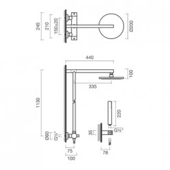 Sistema de duche com torneira termostática para instalar na parede (duches). Cartucho termostático (paragem de segurança aos 38º). Com chuveiro de mão de 220mm e superior de Ø200mm. Consumo estimado de água: 12,9 l/min. Bicomando. Sistema fixo (altura da barra não regulável). Na embalagem: sistema de duche, flexível de 1750mm e kit de fixação.
