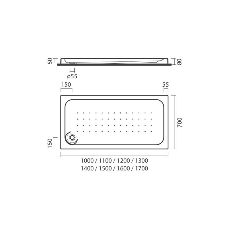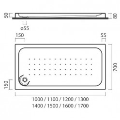 Base de duche de pousar em acrílico, com superfície antiderrapante. De pousar. Altura da cuba interior: 50mm. Altura da aba exterior: 80mm. Com uma válvula de descarga de Ø55mm. Na embalagem: base de duche.