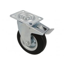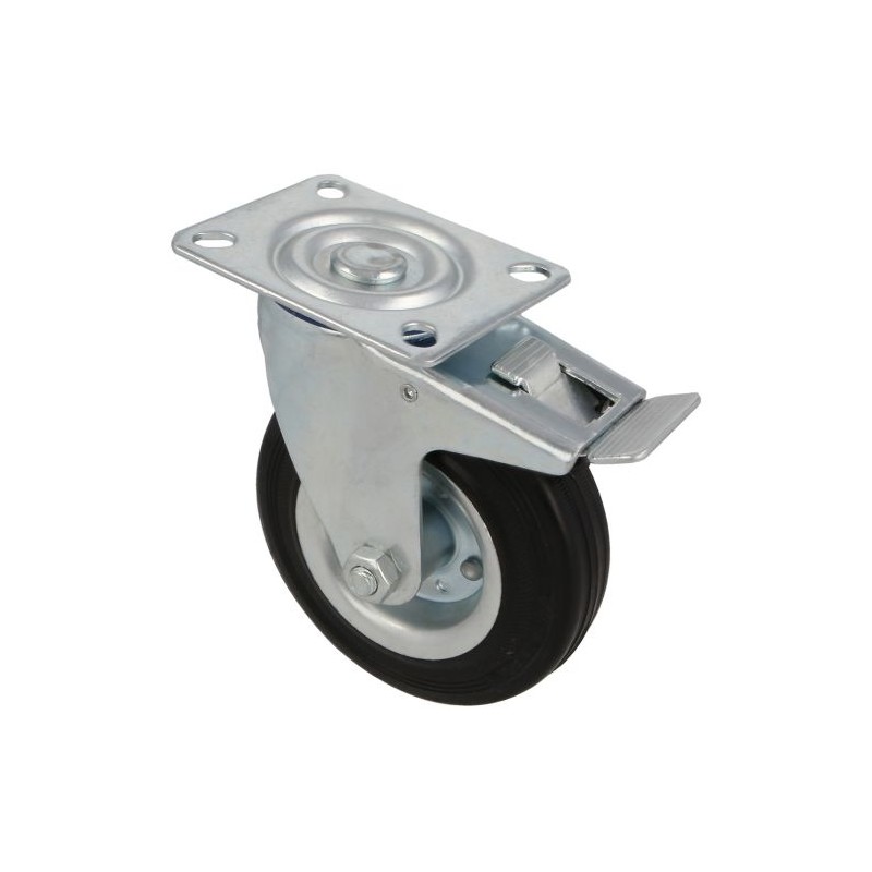Roda de borracha preta de diâmetro 125 com placa e freio e peso máximo de 120 kg.