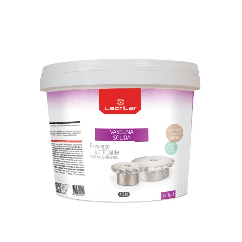 Excelente lubrificante para vários usos como porcas, dobradiças, buchas e engrenagens, pela sua acção hidratante a Vaselina Sólida Lacrilar é também um óptimo protector do alumínio, couro, madeira e ferro.