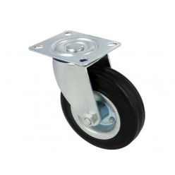 Roda de borracha preta com diâmetro 125 com placa e peso máximo de 120kg.