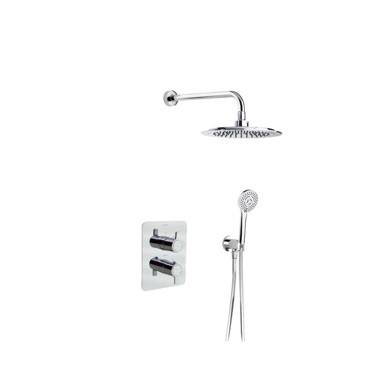 O BLAUTHERM TERM. KIT ENC 2 VIAS CHUVEIRO REDONDO é um conjunto de ducha termostática empotrada, fabricado pela Ramon Soler, que oferece conforto e segurança na sua experiência de banho. Este kit permite a seleção entre duas saídas de água, como o chuveiro principal e a ducha manual, proporcionando versatilidade no uso diário.Design Empotrado: O conjunto é projetado para ser embutido na parede, oferecendo um aspeto clean e moderno ao espaço do banho.Termostato Integrado: Permite a regulação precisa da temperatura da água, garantindo conforto e segurança durante o banho.Rociador Redondo: Inclui um chuveiro redondo com diâmetro de 240 mm, proporcionando uma ampla cobertura de água.Ducha Manual: Acompanha uma ducha manual com três funções, ideal para diferentes necessidades de uso.Acessórios Inclusos: O kit vem completo com suporte de parede fixo com tomada de água, flexo metálico de 1,75 m e sistemas de segurança como o CoolTouch (anti-queimaduras) e Termostop (limitador de temperatura).