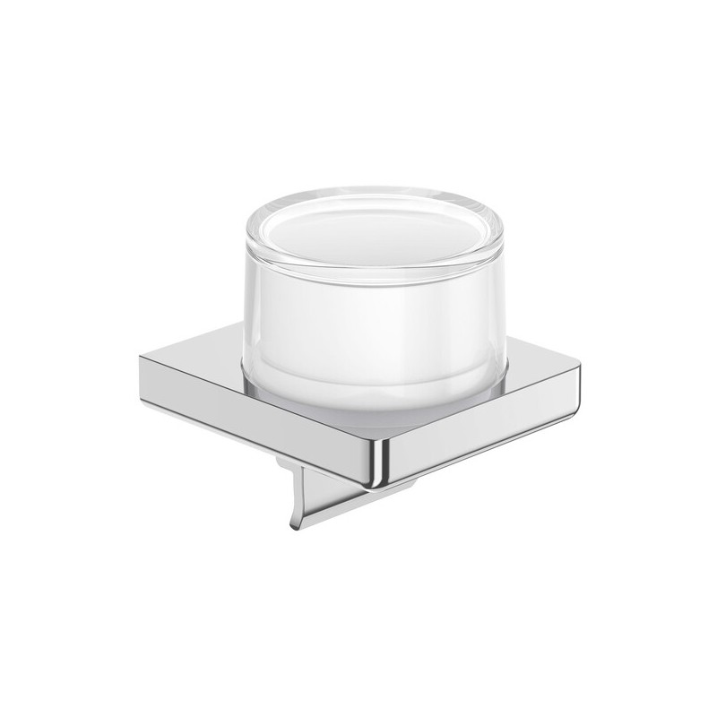 Doseador de sabão de parede em metal e vidro com acabamento cromado e design minimalista indicado para casa de banho com instalação mural por parafusos dimensões aproximadas de 120 mm de comprimento 110 mm de largura e 113 mm de altura estrutura robusta e resistente à corrosão ideal para utilização com sabonete líquido garantindo funcionalidade durabilidade e um aspeto moderno e elegante no espaço.