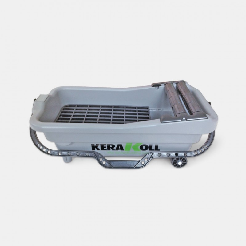 Recipiente para a lavagem de betumações cimentícias e epoxídicas em pavimentos e paredes, dotado de rolos para a limpeza da talocha de esponja e de grelha para a limpeza dos resíduos de betume. Com pega e rodas para um transporte mais fácil.