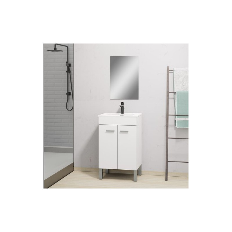 Móvel de casa de banho, de chão, composto por duas portas, uma prateleira fixa e pés acetinados, de acabamento de alumínio. Móvel produzido em superPan de 16 mm com acabamento em laminado. O superPan é um painel constituído por aglomerado de partículas de madeira aglutinadas com resinas (UF), sendo as faces em MDF, conferindo ao painel uma melhor performance mecânica e excelente qualidade da superfície Lavatório cerâmico, de casa de banho, para encastrar produzido em cerâmica sanitária. O espelho de casa de banho é suspenso, Miralite® Revolution produzido em vidro de 4 mm, pela