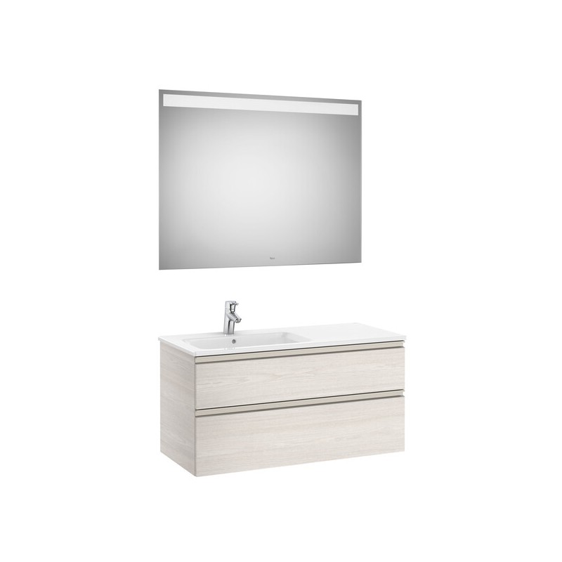 Este pack com móvel base de 2 gavetas, lavatório posicionado à esquerda e espelho com iluminação LED integrada é uma solução completa e harmoniosa para casas de banho modernas que combina arrumação eficiente com um design contemporâneo pensado para otimizar o espaço e a funcionalidade. Os dois gavetões com sistema de fecho suave e separadores internos oferecem amplo espaço organizado para produtos de higiene e acessórios, enquanto o lavatório em porcelana de forma quadrada com prateleira integrada à esquerda e um único orifício para torneira no centro proporciona uma superfície lisa, fácil de limpar e adaptada ao uso diário. O espelho retangular com iluminação LED integrada e índice de proteção IP44 garante luz confortável e eficiente na zona do lavatório, valorizando o ambiente e criando uma atmosfera acolhedora Com medidas aproximadas de 1005 mm de comprimento, 460 mm de profundidade e 537 mm de altura, este conjunto é versátil e pode ser instalado suspenso ou com pés opcionais conforme a sua preferência, oferecendo uma solução estética e funcional que se integra em diferentes estilos de casa de banho. IMAGEM ILUSTRATIVA: TORNEIRA NÃO INCLUÍDA.