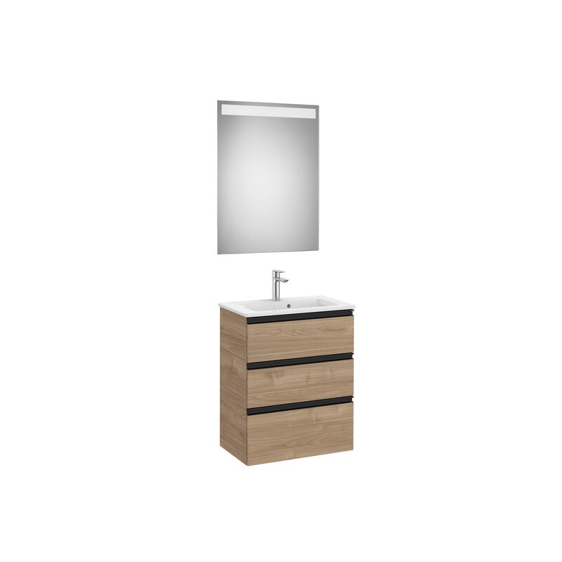 O pack compacto com móvel base de 3 gavetas, lavatório centrado e espelho LED é uma solução completa e moderna para casa de banho com design funcional e linhas clean que integra um móvel base com três gavetas com sistema de fecho suave que facilitam a organização de produtos de higiene e limpeza e maximizam o espaço útil dentro da casa de banho, o lavatório em porcelana branca de forma quadrada possui uma prateleira integrada em ambos os lados e um único orifício central para instalação da torneira diretamente no lavatório, o conjunto inclui um espelho com iluminação LED integrada e índice de proteção IP44 adequado a ambientes húmidos que assegura uma iluminação confortável e segura, a estrutura do móvel em aglomerado robusto foi desenhada para instalação suspensa ou suspensa com pés opcionais e as dimensões totais do conjunto são aproximadamente 605 mm de comprimento, 380 mm de largura e 759 mm de altura com espelho de cerca de 800 mm de altura, disponível em várias opções de acabamento que permitem adaptar o produto a diferentes estilos de decoração mantendo uma estética contemporânea e funcionalidade elevada. IMAGEM ILUSTRATIVA: TORNEIRA NÃO INCLUÍDA.