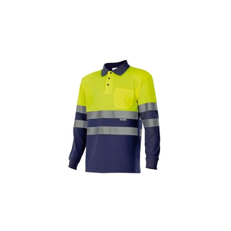 Camisa polo bicolor de alta visibilidade com mangas compridas. Feito de tecido respirável. Fitas reflexivas no tronco e mangas. Pescoço de costela com abertura central com botões, algemas costeladas e um bolso no peito.