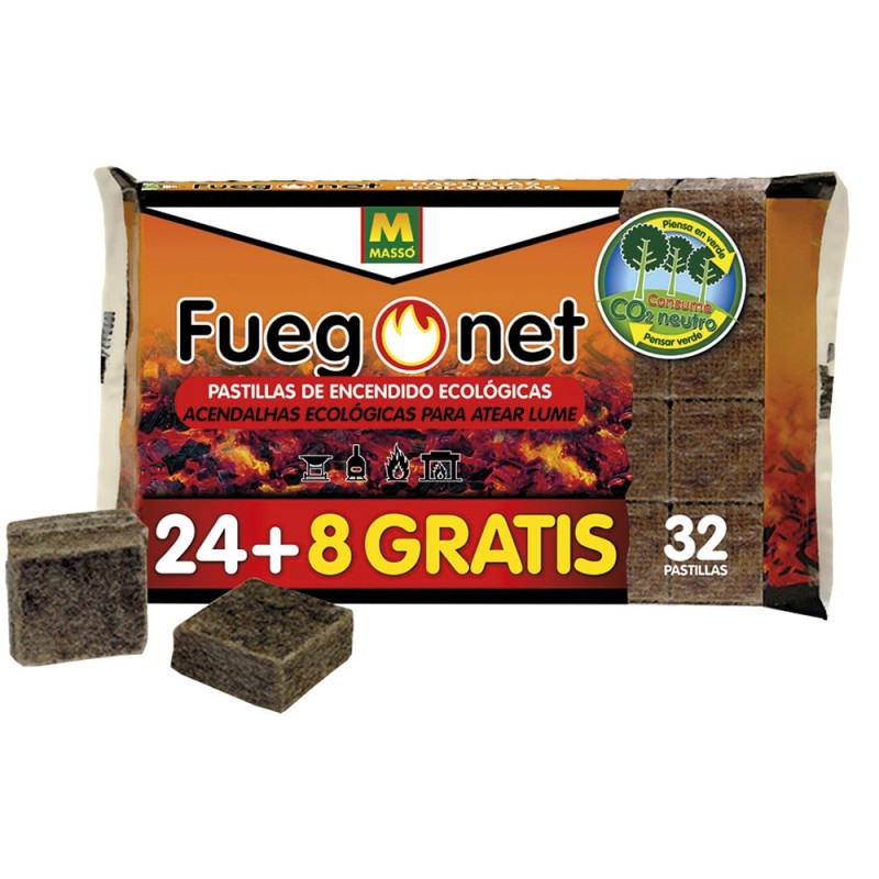 ACENDALHAS ECOLOGICAS 24+8 FUEGONET. LONGA DURAÇAO DE IGNIÇAO E GRANDE PODER CALORIFICO. SAO FEITAS DE MADEIRA VEGETAL E OLEOS VEGETAIS.