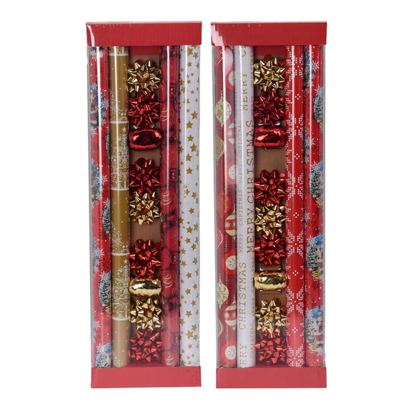 KIT PAPEL DE EMBRULHO 13 PEÇAS. 2 MODELOS SORTIDOS. CADA KIT CONTEM: 4 ROLOS DE PAPEL DE EMBRULHO (200X70CM 56-57G), 2 BOBINES DE FITA PARA LAÇOS (10MX5MM), 7 LAÇOS