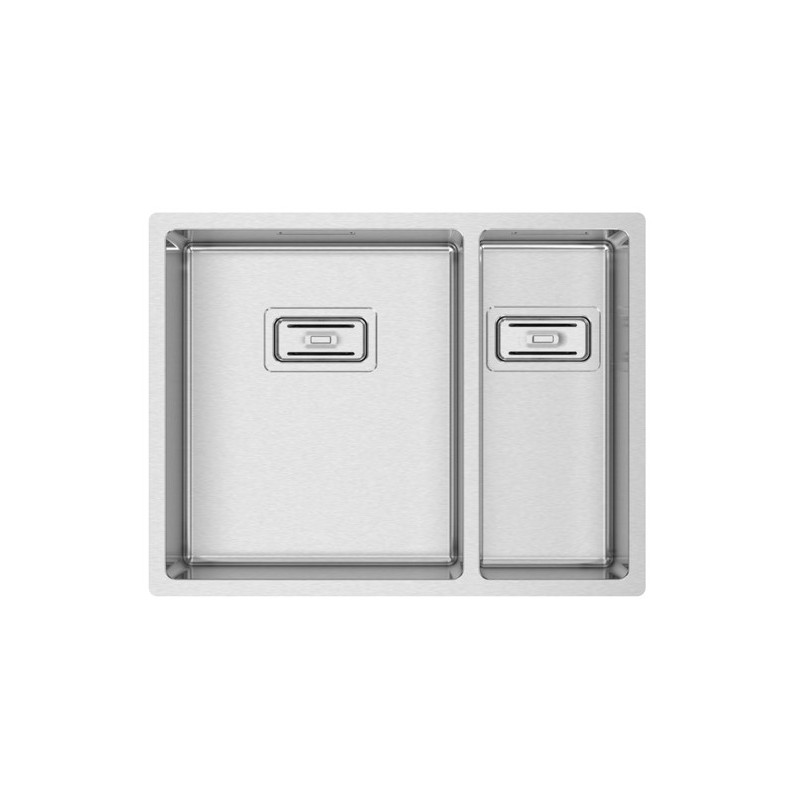 RODI Box Lux 55: Lava-louça de cuba e meia em aço inox com design minimalista de linhas retas e raio de 12 mm, medida externa 570×440 mm, cubas de 340×400 mm + 170×400 mm, profundidade de 200/170 mm, indicada para móvel de 600 mm, com instalação à face, sobre ou sob a bancada.
