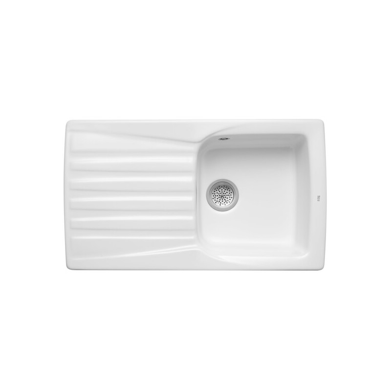 Lava-louça de bancada em grés altamente resistente concebido para cozinhas modernas com uma cuba profunda de 180 mm e escorredor integrado que facilita a drenagem e organização de loiça e utensílios oferece dois orifícios insinuados para torneira e válvula de 3 ½” com ralo incluído garantindo funcionalidade completa e fácil ligação à canalização fabricado em material cerâmico duradouro com acabamento branco e formato retangular reversível que permite adaptar a posição do escorredor segundo a configuração da bancada com dimensões totais de 860 × 500 × 205 mm ideal para utilização diária em espaços domésticos ou profissionais onde a resistência à humidade e ao desgaste é essencial combinando estética sóbria e desempenho prático.
