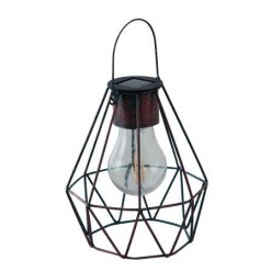Material: metal com lâmpada de plástico. Acabamento de cobre. De mesa ou para pendurar. 2 LED em forma de filamento. Painel solar.