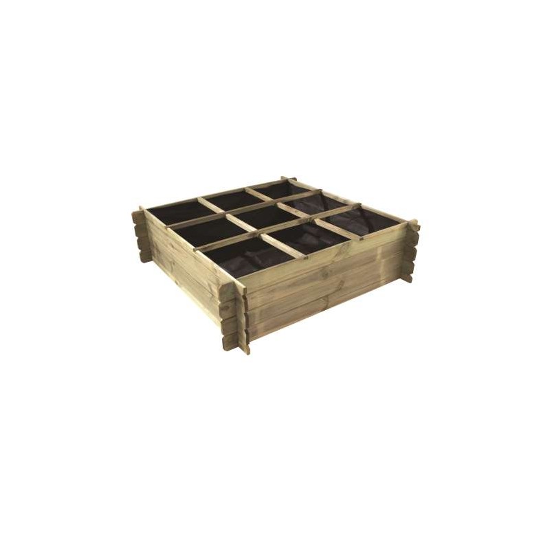 Características: madeira de pinho escocês, tratamento em autoclave III verde, separações para diferentes espaços, saco de geotêxtil incluído.