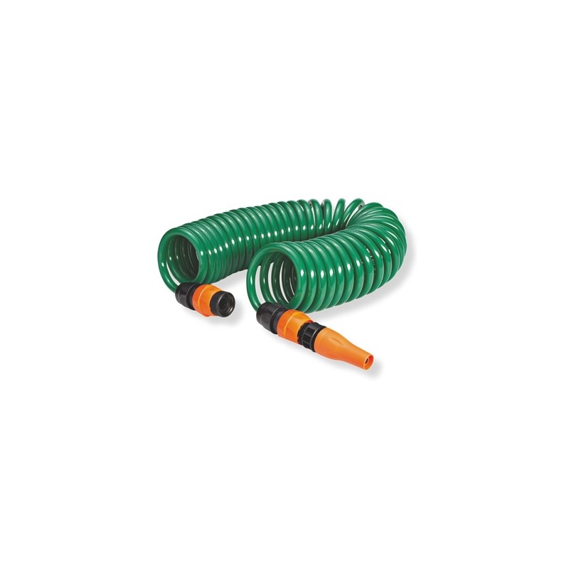 Kit de irrigação constituído por:, 10 m de mangueira de 1/2" em espiral extensível, Tomada de torneira 3/4", Uniões de terminal de mangueira Aperto e Aquastop, Lança de pulverização regulável.