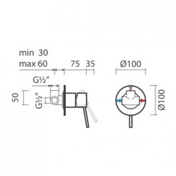 Torneira monocomando para encastrar na parede (duches / banheiras). Cartucho de discos cerâmicos. Monocomando, 1 função. Espelho redondo. Profundidade de