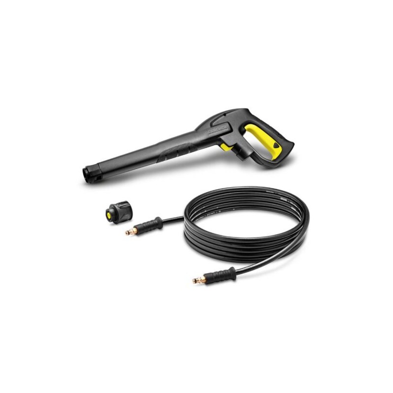Conjunto de acessórios, incluindo mangueira de alta pressão de 4 metros, pistola ergonómica de alta pressão e adaptador para ligação rápida e prática. O conjunto de adaptação ideal para lavadoras de alta pressão desde o ano de fabrico de 1992 (exceto modelos com enrolador de mangueira).