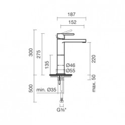 Torneira monocomando para instalar em lavatórios sem furo para torneira. Cartucho de discos cerâmicos e perlator ecológico. Monocomando. Cano alto - 300mm. Na embalagem: torneira, ligações flexíveis e kit de fixação.