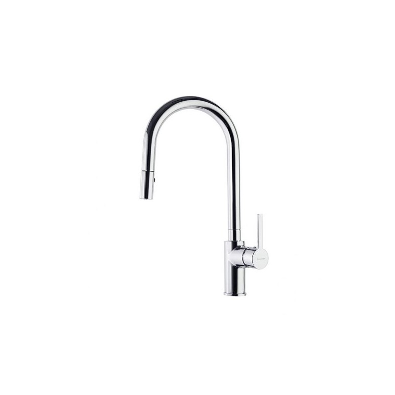Torneira de bica alta para lava-loiça com cabeça metálica minimalista extraível com 2 saídas, cromagem Diamond Finish, sistema de poupança de água S2 50%, limitador de temperatura e sistema anti-corrosão patenteado.