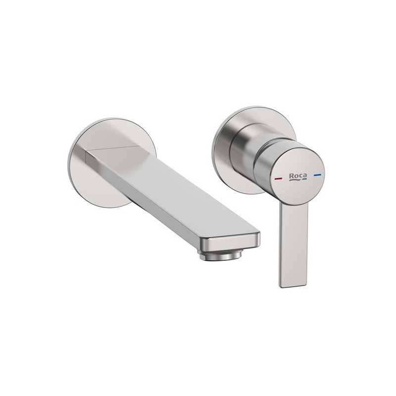 Misturadora monocomando de encastrar para lavatório da Roca da coleção Targa com instalação embutida na parede concebida para um acabamento discreto e elegante com caudal de 5 l/min e nível acústico reduzido (Grupo 1) para poupança de água e energia equipada com cartucho cerâmico de controlo suave de caudal e temperatura e tecnologias Evershine® e SoftTurn® que garantem durabilidade e brilho ideal para casas de banho modernas que valorizam estética limpa e funcionalidade fiável no uso diário compatível com vários acabamentos cromado preto mate branco mate aço inox ou ouro escovado e concebida para ser combinada com corpo de encastrar universal e válvula de esgoto apropriada.