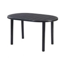 Mesa oval injetada em polipropileno. Pernas ajustadas por pressão. Guarda-sol de 38 mm.