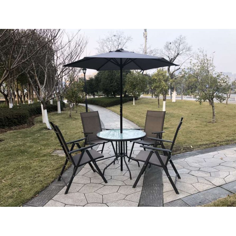 Conjunto composto por mesa com vidro temperado.Com manivela. 4 cadeiras multiposições dobráveis com tubo de aço cor antracite, textileno cinzento-escuro.