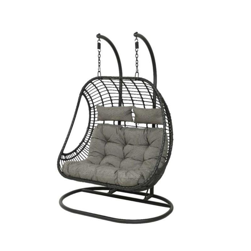 Cadeira suspensa de vime. Estrutura de aço preto-mate. Inclui almofadas cinzentas.