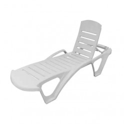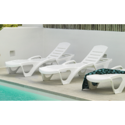Espreguiçadeira de resina empilhável com encosto multiposições.