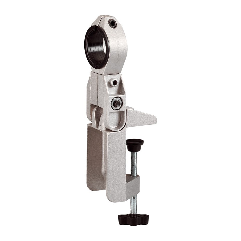 Porta-brocas, para brocas com colar Euro Ø 43 mm, giratório 360°, gira na vertical até 90°, opção de fixação horizontal e vertical, para uso rápido estacionário de brocas, motores de fresagem e retificação em bancadas, mesas de trabalho e tampos de mesa para lixar, afiação, limpeza e polimento