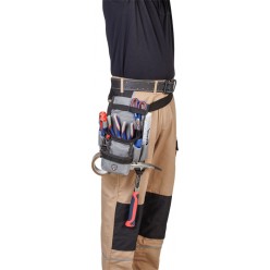 Bolsa de ferramentas, 1 peça, em nylon preto/prata, com cinto de nylon, qualidade robusta, costura dupla com fio prateado, com cinto de nylon (comprimento 75-135 x 5 cm), 1 bolso grande para pregos, 1 grande compartimento com 2 alças elásticas grandes e 2 pequenas, 3 compartimentos estreitos, 3 compartimentos para chave de fenda, 1 alça para martelo, 1 alça com mosquetão, incluindo etiqueta kwb WORK WEAR, 210 x 190 x 85 mm.