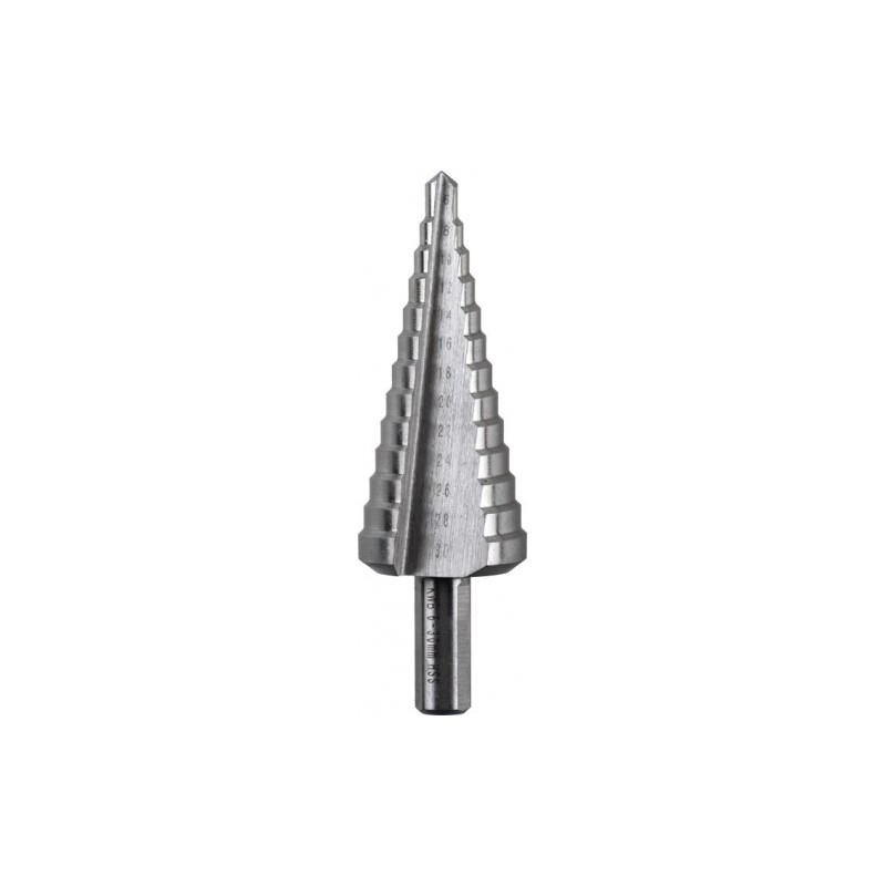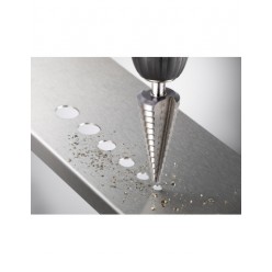 Broca escalonada, HSS, com ponta inicial, para furação de pequenos a grandes diâmetros com pré-furação em chapas finas, sem rebarbas graças ao quebra-cavacos, sem encruamento, graduada nos tamanhos de brocas mais populares, para chapas de aço, metais não ferrosos e plásticos.