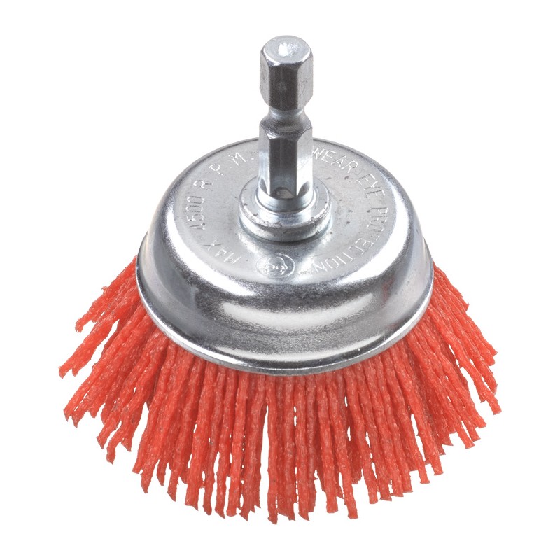 Escova copo, nylon, abrasivo de óxido de alumínio, flexível, para lixagem fina, para limpeza, remoção de tinta, verniz e descoloração de soldadura, em aço inoxidável, para madeira, metal, liga leve, metais não ferrosos, também adequado para revestimento de madeira, para trabalhar em superfícies de tamanho médio.