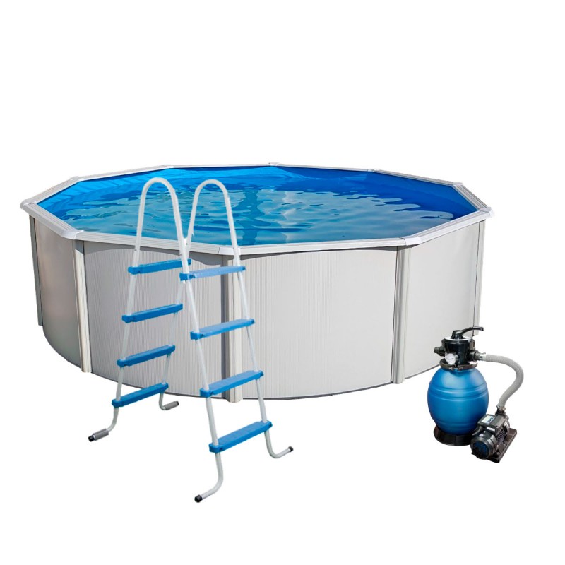 Incluído sistema de filtração de filtro de areia e bomba monobloc 4 m3/h. O forro é de PVC de cor azul e sistema overlap, com tratamento anti-ultravioleta e uma grossura de 30/100 nas laterais e 38/100 na base. Possui skimmer que inclui as mangueiras de conexão do filtro de 32 mm de diâmetro. As paredes são em chapa laminada em frio com tratamento de galvanização, fosfatização, impressão branca e lacada. Possui um fecho com dupla fila de parafusos para maior segurança. Os perfis são metálicos lacados em branco (15 cm / 14 cm).