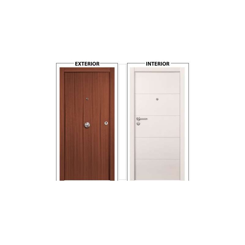 Porta bloco blindada exterior, chapa de sapelly, veio vertical e interior maciço liso lacado branco, aro 90 x 28 extensível, 1 batente com 4 dobradiças, fechadura de 3 pontos, maçaneta,