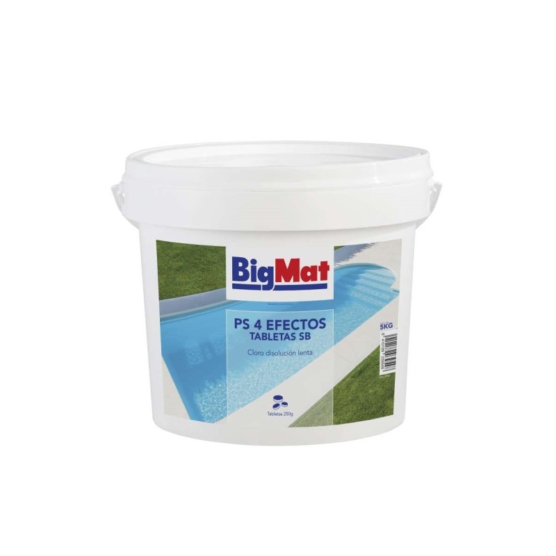 O Cloro BigMat 4 Efeitos Pastilhas 250g - 5 kg é um produto multifuncional destinado à manutenção da água da piscina. Combinando quatro ações essenciais — desinfetante, antialgas, floculante e anticalcário —, estas pastilhas de dissolução lenta garantem uma água limpa, cristalina e segura para os banhistas. Causa irritação severa nos olhos. Pode agravar um incêndio, oxidante. Pode irritar as vias aéreas.