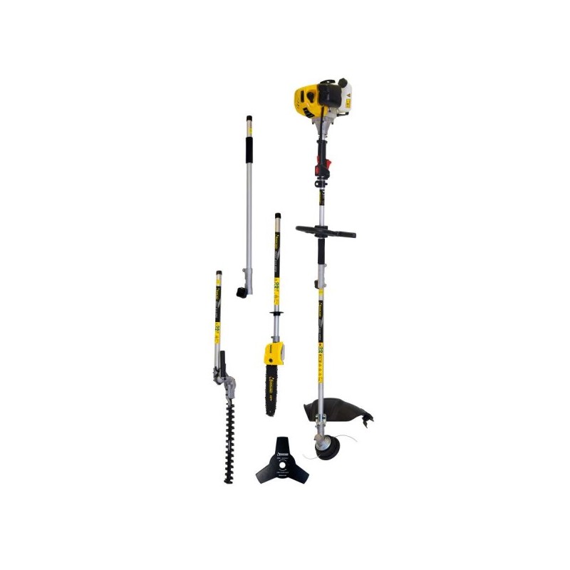 Sistema 5 em 1. Pega rebatível. Inclui extensão, cabeça porta-fio automática, disco de 3 pontas, acessório corta-sebes, acessório de poda/motosserra de 8".