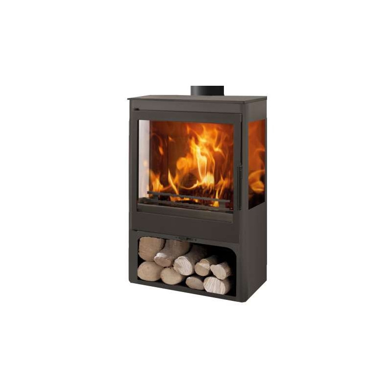 Grelha e porta de ferro fundido. Pintura resistente. Sistema vidro limpo. Lenheiro. Combustão tripla.