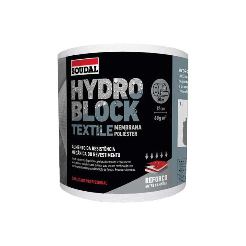 O HydroBlock Textile é um tecido não tecido de poliéster, perfurado e tratado termicamente, sem adesivo ou aglutinante químico para uso em combinação com membranas líquidas para colmatação de fendas, fissuras e aberturas. Ideal para aplicações de selagem de juntas, fissuras e fendas.