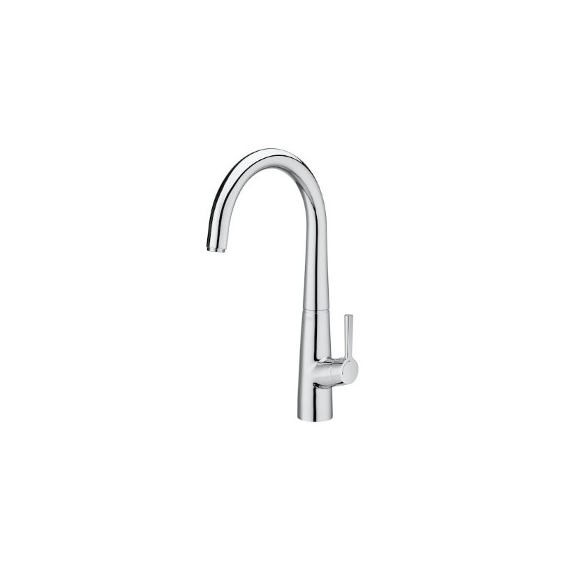 Misturadora monocomando para lava-louça Roca Syra A5A842AC00 com cano curvo giratório em acabamento cromado de alta resistência concebida para instalação de bancada na cozinha, equipada com ligações de alimentação flexíveis incluídas e posição do tirador lateral que permite um controlo ergonómico de caudal e temperatura com abertura em água fria que favorece poupança de energia e conforto no uso diário, apresenta um bico alto giratório que facilita o alcance sobre a cuba e combina design limpo e prático com desempenho fiável suportado pelas tecnologias Evershine® e SoftTurn®, ideal para cozinhas contemporâneas onde se pretende funcionalidade e facilidade de manutenção técnica contínua em lava-louça domésticos ou profissionais