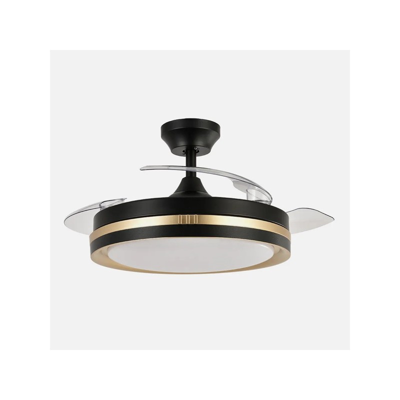 Ventoinha DC da série VIPER de cor PRETO/OURO com três pás DESMONTÁVEIS, muito resistentes. Fabricado em metal, ABS e policarbonato. Com um design moderno e muito original, tem um anel na sua estrutura para combinar com diferentes materiais, incorporando-o como uma parte importante da sua decoração. Dispõe de seis velocidades reguláveis. Motor de corrente contínua. Tecnologia LED integrada com uma potência de 72W, 7200 lúmens e 3 TEMPERATURAS DE LUZ SELECCIONÁVEIS (3000-4500-6000K), luz quente, luz natural e branco frio. Controlo do ar no verão ou no inverno. O seu tamanho é de 36,5/49X49 centímetros com as lâminas dobradas e 36,5/49X107 centímetros com as lâminas desdobradas, com DOIS TAMANHOS para instalação em diferentes alturas de teto. Controlo remoto INCLUÍDO com MEMÓRIA DE CORES e TEMPORIZADOR 1/2/4/8 H.