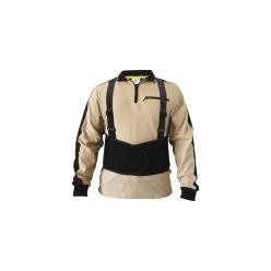 Cinto lombar regulável por banda de velcro. Ajusta por dupla banda elástica. Suspensórios de posicionamento reguláveis. Reforço nas costas por 4 varetas.