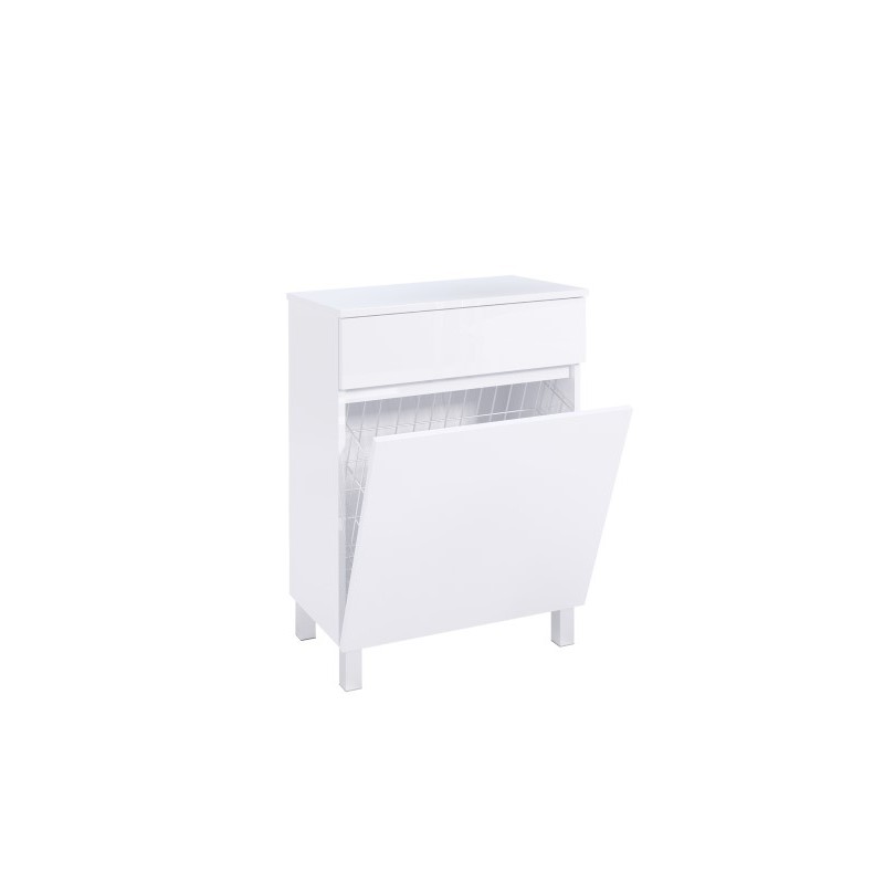 Móvel auxiliar de casa de banho, de chão, composto por uma porta, uma Tulha, uma gaveta Folding (Max.10kg) e pés acetinados, de alumínio. Móvel produzido em superPan de 16 mm com