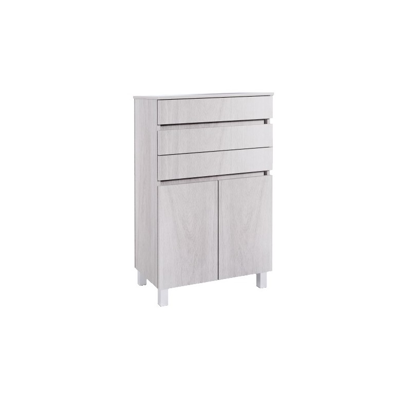 Móvel auxiliar de casa de banho, de chão, composto por duas portas, uma prateleira fixa, três gavetas Folding (Max.10kg) e pés acetinados, de alumínio.Móvel produzido em superPan de 16 mm com acabamento em laminado ou lacado. O superPan é um painel constituído por aglomerado de partículas de madeira aglutinadas com resinas (UF), sendo as faces em MDF, conferindo ao painel uma melhor performance mecânica e excelente qualidade da superfÍcie O material utilizado cumpre com os requisitos da Classe E1 (analizado segundo EN ISO 12460-5) definidos na Norma Europeia EN 312:2010. Possui selo de qualidade de AITIM. Também possui certificação PEFC