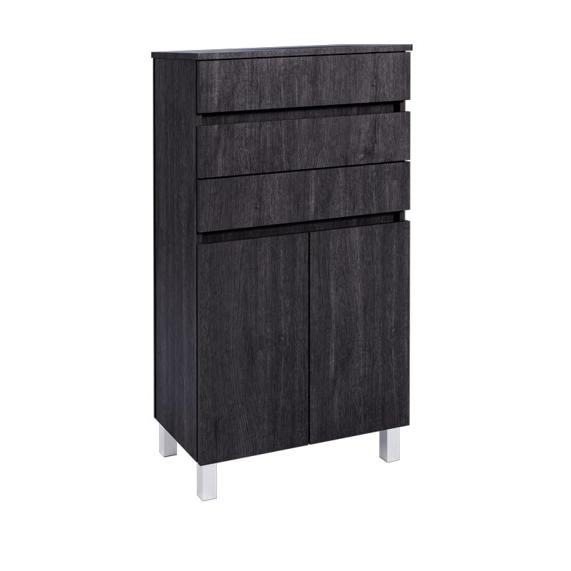 Móvel auxiliar de casa de banho, de chão, composto por duas portas, uma prateleira fixa, três gavetas Folding (Max.10kg) e pés acetinados, de alumínio.Móvel produzido em superPan de 16 mm com acabamento em laminado ou lacado. O superPan é um painel constituído por aglomerado de partículas de madeira aglutinadas com resinas (UF), sendo as faces em MDF, conferindo ao painel uma melhor performance mecânica e excelente qualidade da superfÍcie O material utilizado cumpre com os requisitos da Classe E1 (analizado segundo EN ISO 12460-5) definidos na Norma Europeia EN 312:2010. Possui selo de qualidade de AITIM. Também possui certificação PEFC