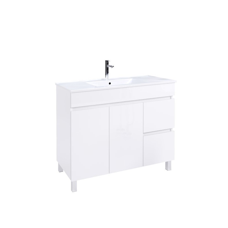 Móvel de casa de banho, de chão, composto por três portas, uma prateleira fixa, uma gaveta Folding (Max.10kg) e pés acetinados, de alumínio Móvel produzido em superPan de 16 mm com acabamento em laminado ou lacado. O superPan é um painel constituído por aglomerado de partículas de madeira aglutinadas com resinas (UF), sendo as faces em MDF, conferindo ao painel uma melhor performance mecânica e excelente qualidade da superfície. O material utilizado cumpre com os requisitos da Classe E1 (analizado segundo EN ISO 12460-5) definidos na Norma Europeia EN 312:2010. Possui selo de qualidade de AITIM. Também possui certificação PEFC. Móvel 990X710X450mm Peças de Fixação